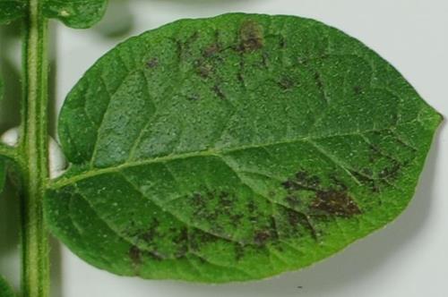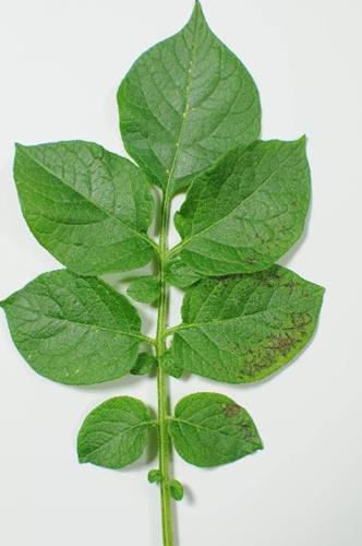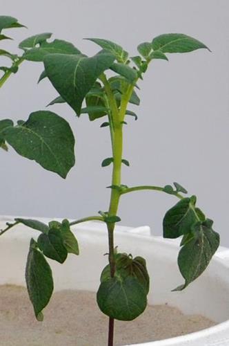 Scheuten staan rechtop en zijn dun met bleke donkergroene bladeren. De onderste bladeren laten een vies, donkere zweem zien en hangen naar beneden. Stengels laten onderaan ook een donkere verkleuring zien. De groei is ernstig verstoord.