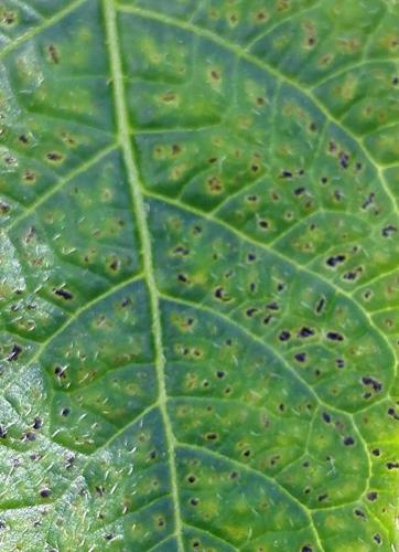 De symptomen beginnen op het jonge blad. De nerven blijven in eerste instantie lichtgeel maar er gaan zich zwarte vlekken ontwikkelen langs de nerven.
