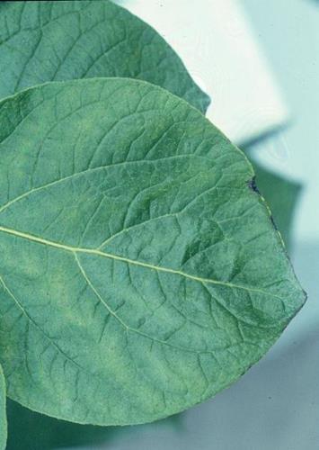 De symptomen beginnen op het jonge blad. De nerven blijven in eerste instantie groen maar er gaan zich zwarte vlekken ontwikkelen langs de nerven. Lichte komvorming van het hele blad. Het blad bij de toppen van de scheuten blijven klein en zijn chlorotisch/necrotisch.