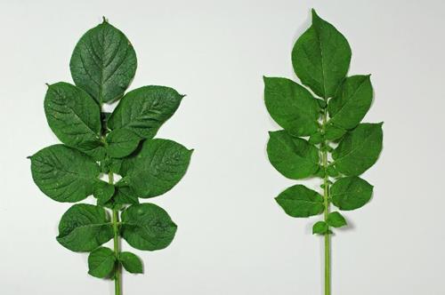 De bladeren (rechts) zijn onvolgroeid en laten een uniforme, chlorotische, lichtgroene/gele verkleuring zien.