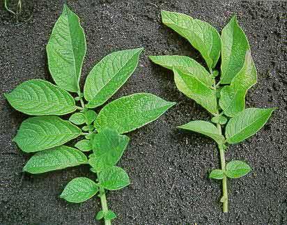 De planten aan de linkerkant laten egaal lichtgroene bladeren zien en een verstoorde groei. Normaal is het oude blad het eerst aangetast en dit kleurt geel en sterft vroeg af.