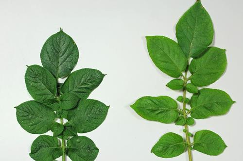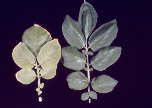 De lichtgroene/gele bladeren (links) zijn kleiner van afmeting en de groei kan belemmerd worden. Meestal zijn de symptomen het eerst waarneembaar op het jonge blad.