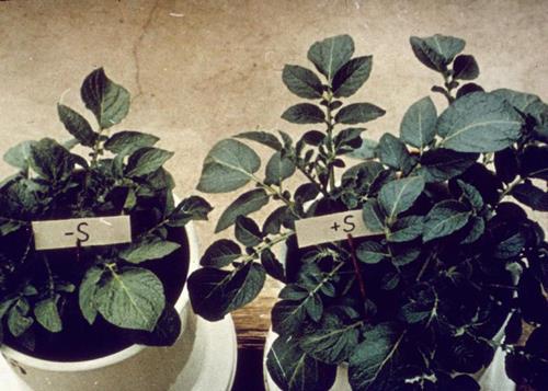 Ernstig zwavelgebrek (rechts).