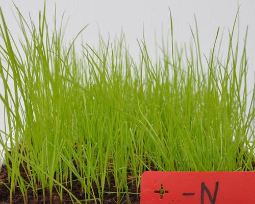 Lichtgroene kleur, achterblijvende groei en slechte bodembedekking door gebrek aan stikstof.