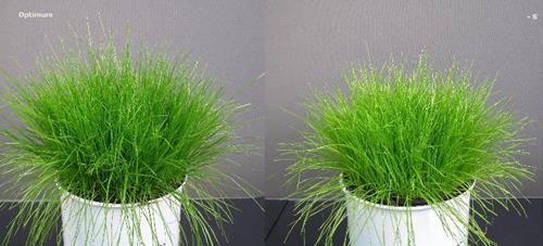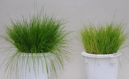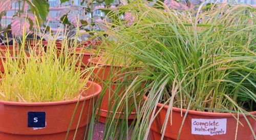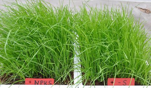 Zwavelgebrek (S) (rechts). De symptomen van zwavelgebrek komen overeen met stikstofgebrek, alleen is deze het eerst zichtbaar op jonge bladeren.