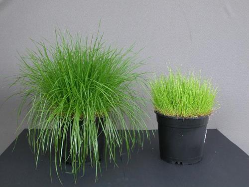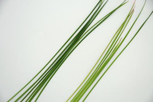 De complete plant is geelgroen van kleur. Bladpunten kleuren lichtbruin tot wit en breken gedeeltelijk af, waardoor de plant een gedrongen uiterlijk krijgt.