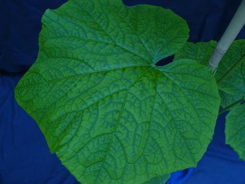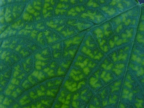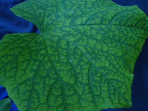 Symptomen van ijzergebrek komen meestal op het jonge blad voor, maar in het onderhavige geval is er duidelijk tussen de nerven van het oudere lagere blad chlorose zichtbaar. Blijkbaar was er, in een jong stadium, een tijdelijk gebrek dat inmiddels overwonnen is.