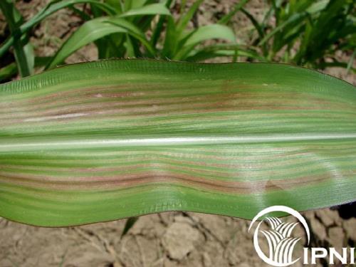 Eerste symptoom is chlorose tussen de nerven in de oudere bladeren. Met een toenemend gebrek verkleuren de geel/witte strepen naar rood/paars gestreepte lesies