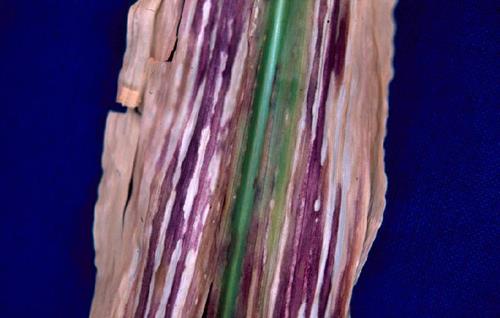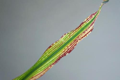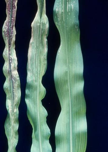 Ernstig aangetast blad (links) vertoont rode en paarse tinten met gestreepte lesies tussen de nerven. Terwijl milder aangetast blad (midden en rechts) alleen chlorose vertoont tussen de nerven.
