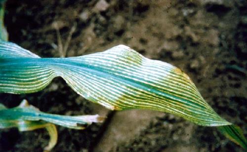 Eerste symptoom is chlorose tussen de nerven bij de oudere bladeren. Gele tot witte strepen of typisch gevormde lesies gaan ontstaan; weefsel langs de hoofdstengel blijft de langste tijd groen.