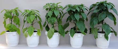 Stikstofgebrek in verschillende graden van ernstig (links) tot optimale voorziening.