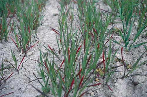 Voorjaarsgewassen kunnen bij koud weer op de oudere bladeren rood of paarsverkleuring vertonen. Wortel- en stengelbeschadiging of een slechte bodemstructuur kunnen dezelfde symptomen veroorzaken.