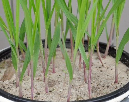 Planten zijn onvolgroeid en vertonen paarsverkleuring, vooral in het midden van de oudere bladeren en de stengels. Bladoppervlak is vaak minder dan bij gezond gewas.