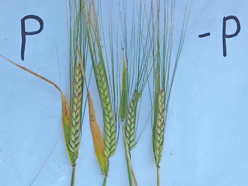 Verschillende graden van fosfaatgebrek (links) in vergelijking met een gezond gewas.