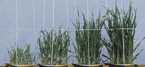 Groei van het gewas is grondig verstoord. Het kleur van de bladeren is bleker dan normaal.