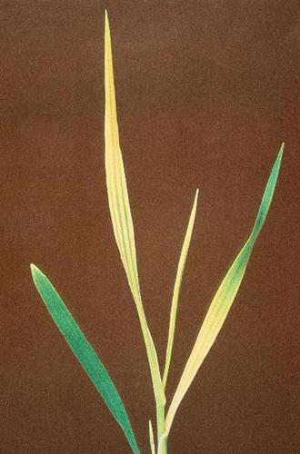 IJzer (Fe) gebrek veroorzaakt chlorose tussen de nerven van de jonge bladeren, dit gaat vaak samen met geel groene strepen op het blad. Bij een toenemend gebrek wordt het volledige blad geel en worden ook de oudere bladeren aangetast.