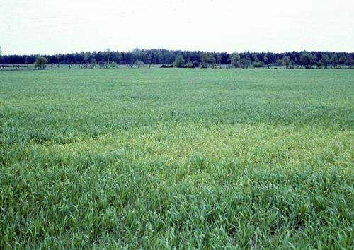 Bladeren vertonen chlorose en de plant vertoont dwerggroei.