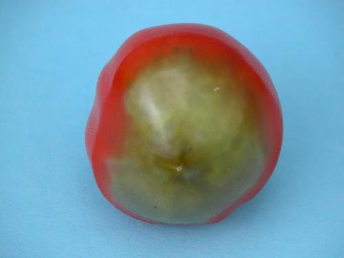 Lichte aantasting van neusrot. De meer ernstige aangetaste planten laten donkere verzonken plekken zien op het uiteinde van de rijpe vrucht. Deze plek tekent zich scherp af tegen de rest van de vrucht.