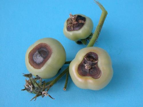 Aangetaste planten laten een donkere verzonken plek zien op het uiteinde van de rijpe vrucht. Deze plek tekent zich scherp af tegen de rest van de vrucht.