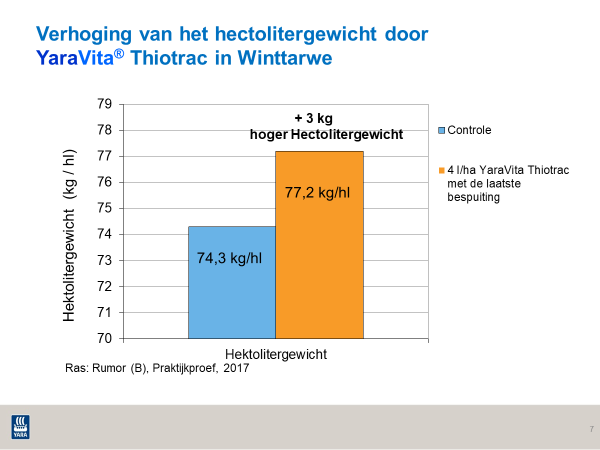 Naast de basisbemesting met Sulfan, is de toepassing van YaraVita Thiotrac aanbevolen. Deze bladmeststof bevat 200 g/l stikstof en 300 g/l zwavel (S). Thiotrac kan worden toegepast tot het BBCH-stadium 79. We raden een toepassing aan van 2x 3l/ha (BBCH 39-79) of een eenmalige toepassing van 5 l/ha (BBCH 59-79). Onderstaande proefresultaten laten goed de meerwaarde van YaraVita Thiotrac zien.