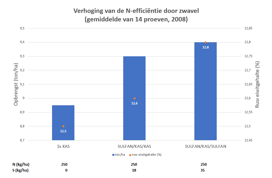 Zwavel is essentieel voor de vorming van eiwit, aminozuren en enzymen in de plant. Daarnaast zorgt zwavel voor een betere opname van stikstof in de plant. Planten nemen stikstof voornamelijk op als nitraatstikstof. Ophopingen ontstaan echter als er niet voldoende (door het zwavel gemaakte) enzymen in de vorm van nitraat- en nitrietreductase gevormd worden. De toevoeging van zwavel als meststof draagt daardoor bij aan het verhogen van de NUE.