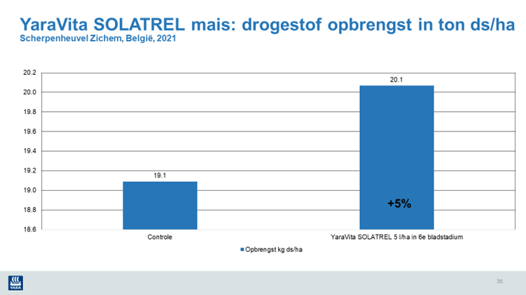 Kunt u geen fosfaat als bladmeststof gebruiken (i.v.m. derogatie) op uw bedrijf? Geen probleem. Dan is YaraVita Biotrac de beste keuze als bladmeststof. Deze bladmeststof met biostimulant heeft in verschillende proeven bewezen dat het mais door moeilijke tijden kan loodsen en zo de basis legt voor een hogere opbrengst. Het bevat bioactieve stoffen gecombineerd met een mix van borium, kalium en zink, waardoor de plant aanzienlijk sterker wordt. Onderstaand proef laat een meeropbrengst in mais zien bij de toepassing van YaraVita Biotrac.